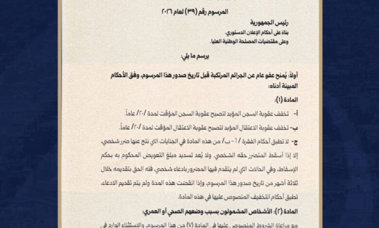 وينص المرسوم على تخفيض عدد من العقوبات، ومنح إعفاءات خاصة لفئات محددة، إلى جانب تحديد شروط واضحة للاستفادة من أحكام العفو، مع استثناء جرائم بعينها من الشمول.