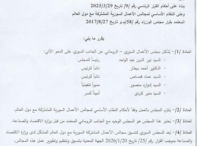 ويعد هذا المجلس، وفقاً للقرار، المرجعية والجانب السوري الوحيد المعتمد لدى الوزارة في إدارة العلاقات الاقتصادية مع رومانيا، حيث سيعمل تحت مظلة “المجلس السوري لتنسيق مجالس الأعمال المشتركة” تنفيذاً للضوابط الصادرة مطلع عام 2026. ويدخل هذا القرار حيز التنفيذ فور صدوره اليوم 29 آذار، ليبدأ المجلس مهامه في تفعيل قنوات التواصل الاقتصادي بين دمشق وبوخارست بما يخدم مصالح القطاعين العام والخاص في البلدين.