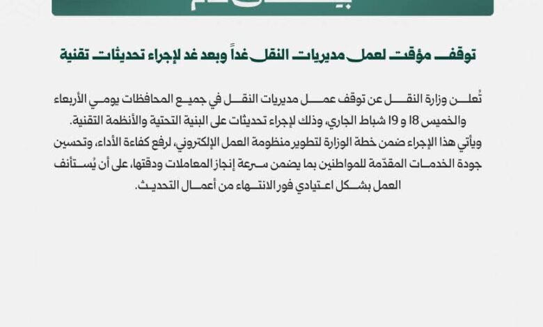 سيريالايف _أعلنت وزارة النقل السورية عن توقف مؤقت لعمل مديرياتها في جميع المحافظات، وذلك خلال يومي الأربعاء والخميس الموافقين 18 و19 شباط، بهدف تنفيذ تحديثات تقنية على البنية التحتية والأنظمة الرقمية المعتمدة في العمل.